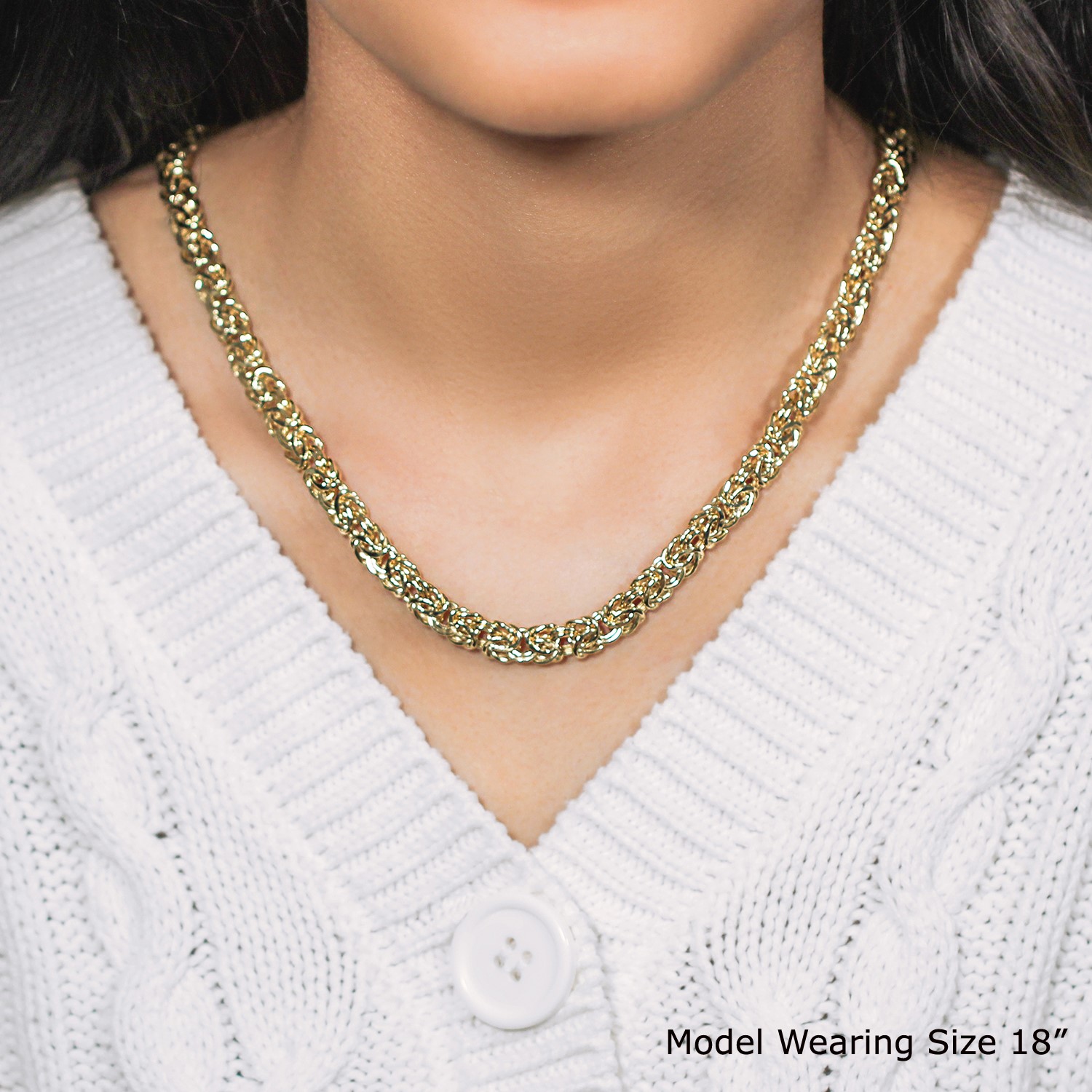 Exuding alluring style, this necklace features a byzantine chain design. A beautiful 14k yellow gold piece measuring 18 inches and 20 inches and secured with a lobster clasp.