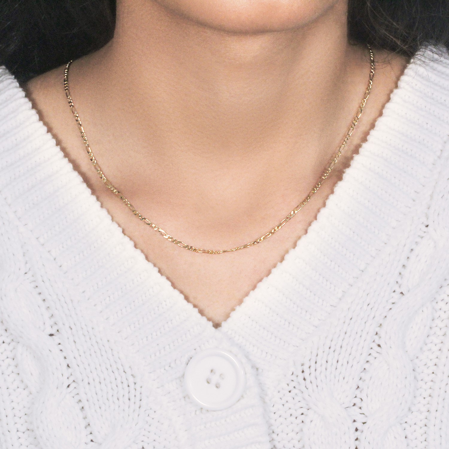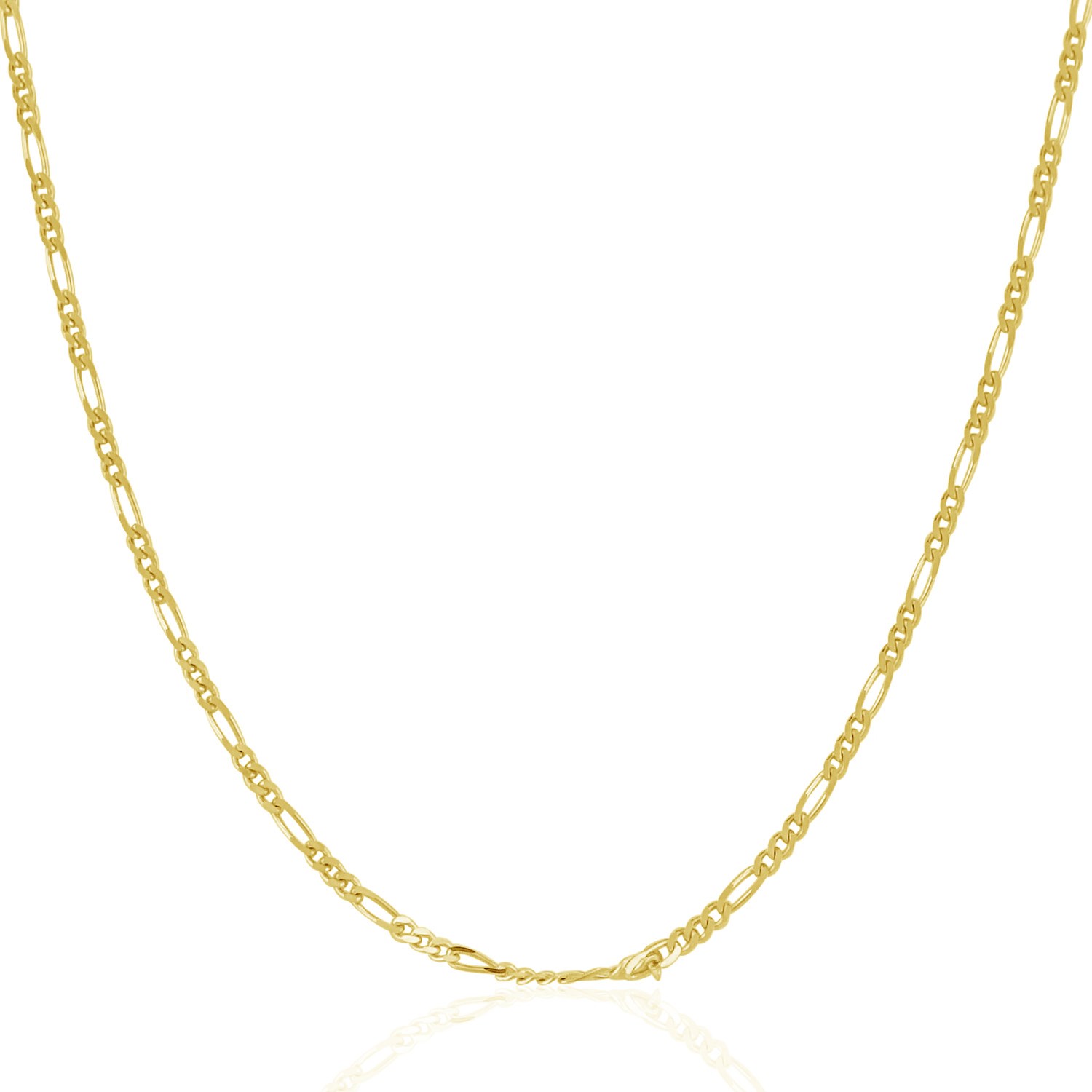 This solid Figaro chain comes in 14k yellow gold and has a width of 1.9 millimeters.