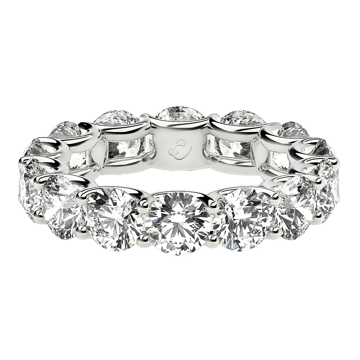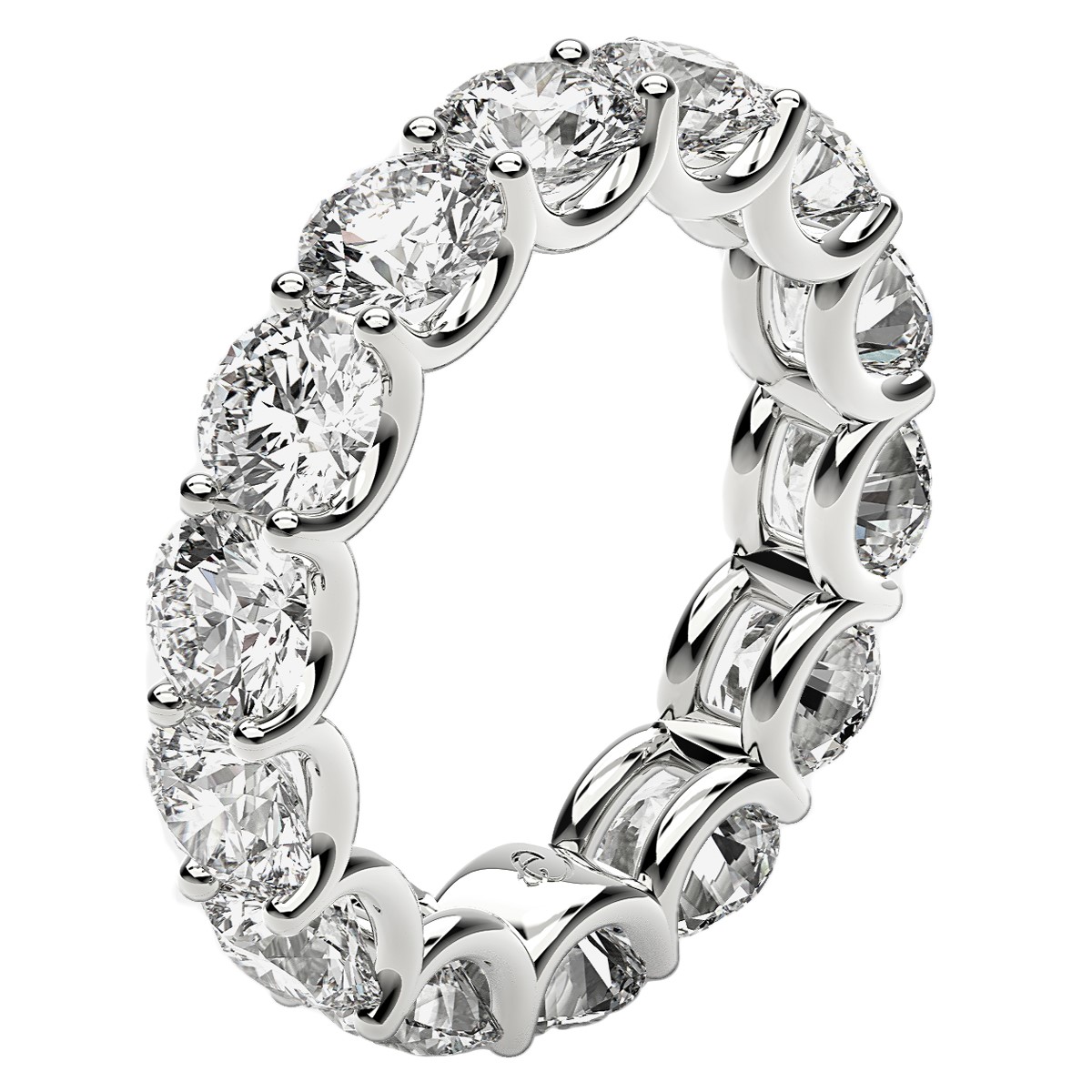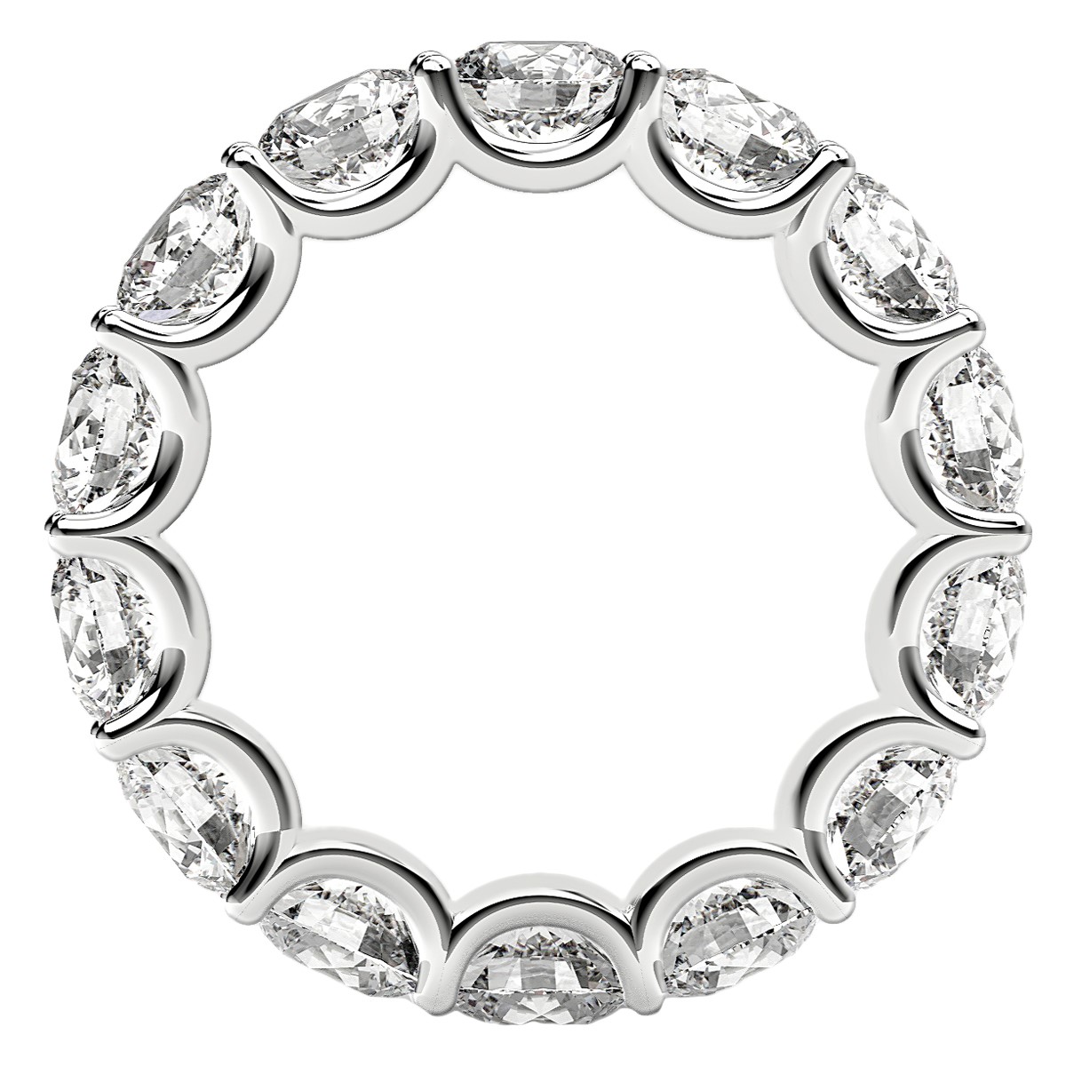 Intriguing curved prongs of glimmering 14k white gold encircle beautiful round cut lab grown diamonds with elegant, arch-like waves of shine in this spectacular eternity ring, adding contrast and organic shape to a traditional setting. This ring belongs to the Eternity Us collection.